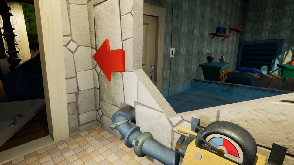• The player switches the heater to the heating position to melt the ice. Then the player frees the valve with the wheel to drain the water and kills the shark. After doing this, the player unlocks the blue lock to enter the laundry room and turns on Tube 2.